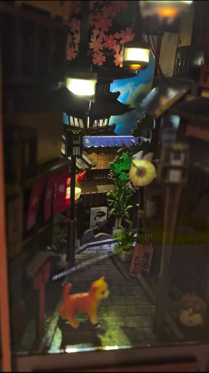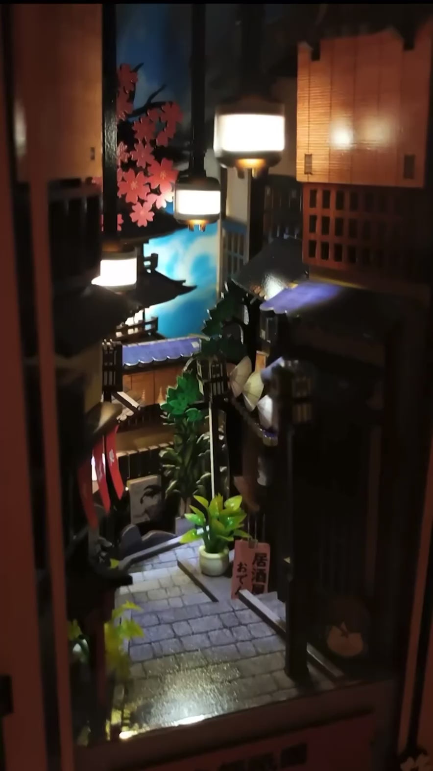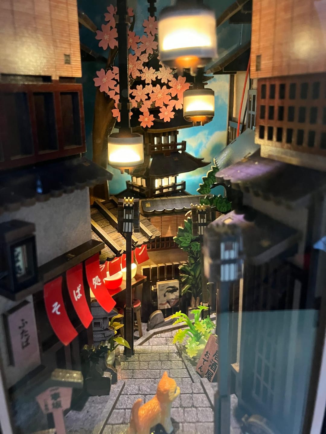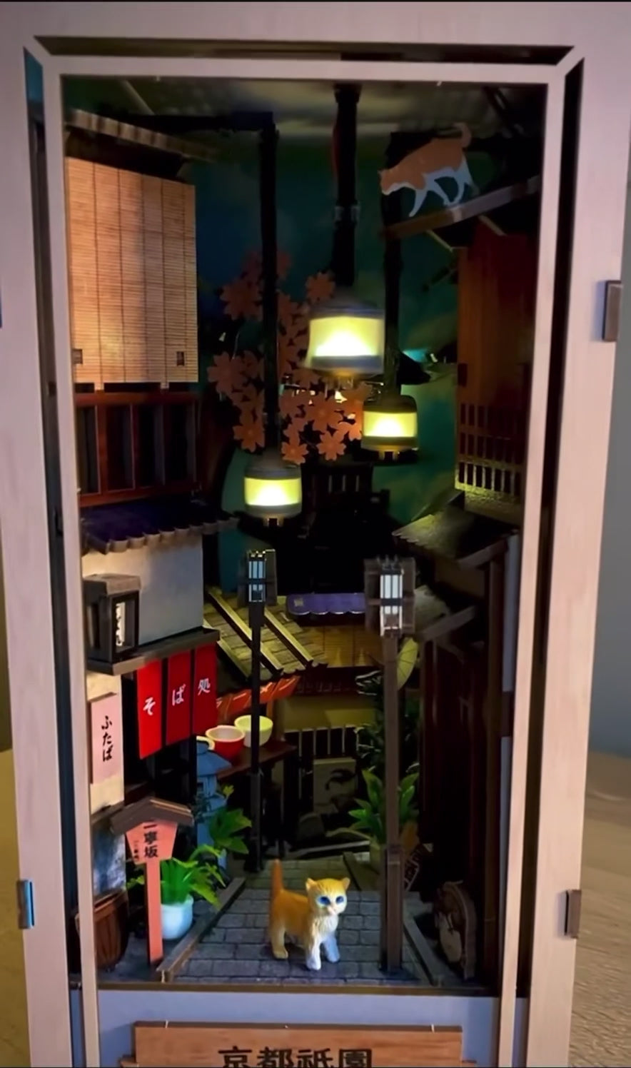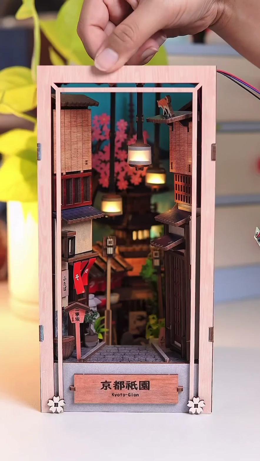 Es un kit de construcción en miniatura inspirado en las tranquilas calles del barrio de Gion en Kioto. Tú mismo montas la escena: casas japonesas, faroles, cerezos y la famosa pagoda. Una vez terminado, se convierte en una pieza decorativa única y luminosa.